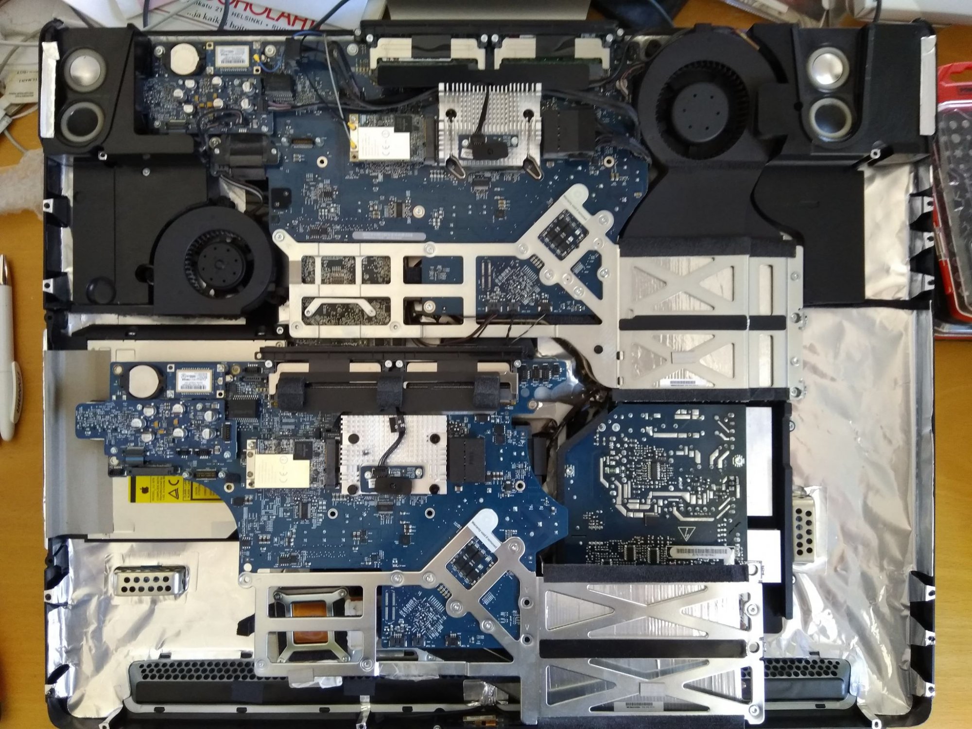 The most difficult part in reassembly was attaching the inverter cable to the power supply. I had to unscrew the PSU from the case to get the cable in place, then screw it back in place with one hand. Despite this I failed on the first attempt. When I restarted the iMac the display stayed black. I could hear the boot chime and all four status LEDs lit up. Unfortunately I had not enabled any form of sharing, so the Mac did not show up on my network. After some experimenting I did manage to put the Mac to sleep, so I knew the backlight was the issue. Also LEDs 3 and 4 indicated that the GPU was on and communicating with the LCD.