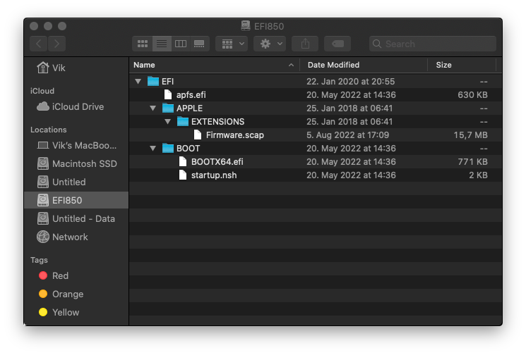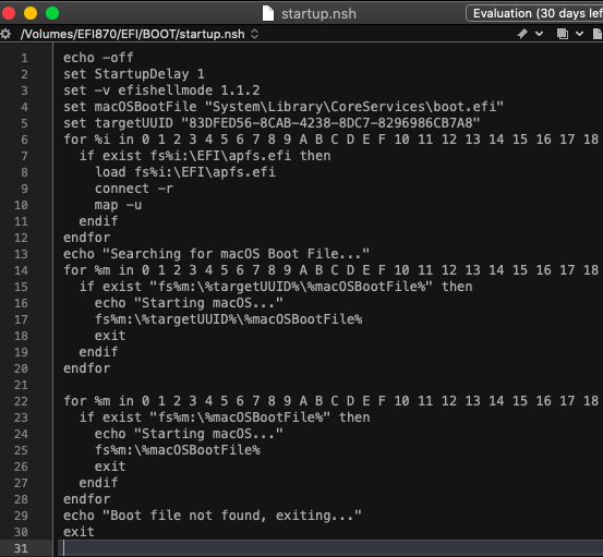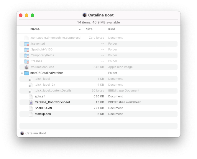 I was hoping SuperDuper includes the EFI in the clone but had my doubts. Cloning with SD, there's very limited choices but I selected "all files". How can I check if the EFI made it across? Did not point files in the start up script, as I don't know how. Your suggestions of moving dosdude file for mutiple partions seems great but tbh it could be beyond my knowledgebase. I'd be quite happy to just being able to select the new drive as a boot volume. No other drives will get the patch going forward and hope to upgrade to a supported OS in 1/2 year.