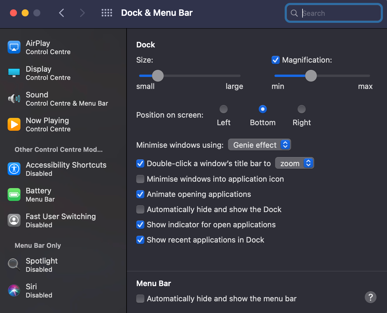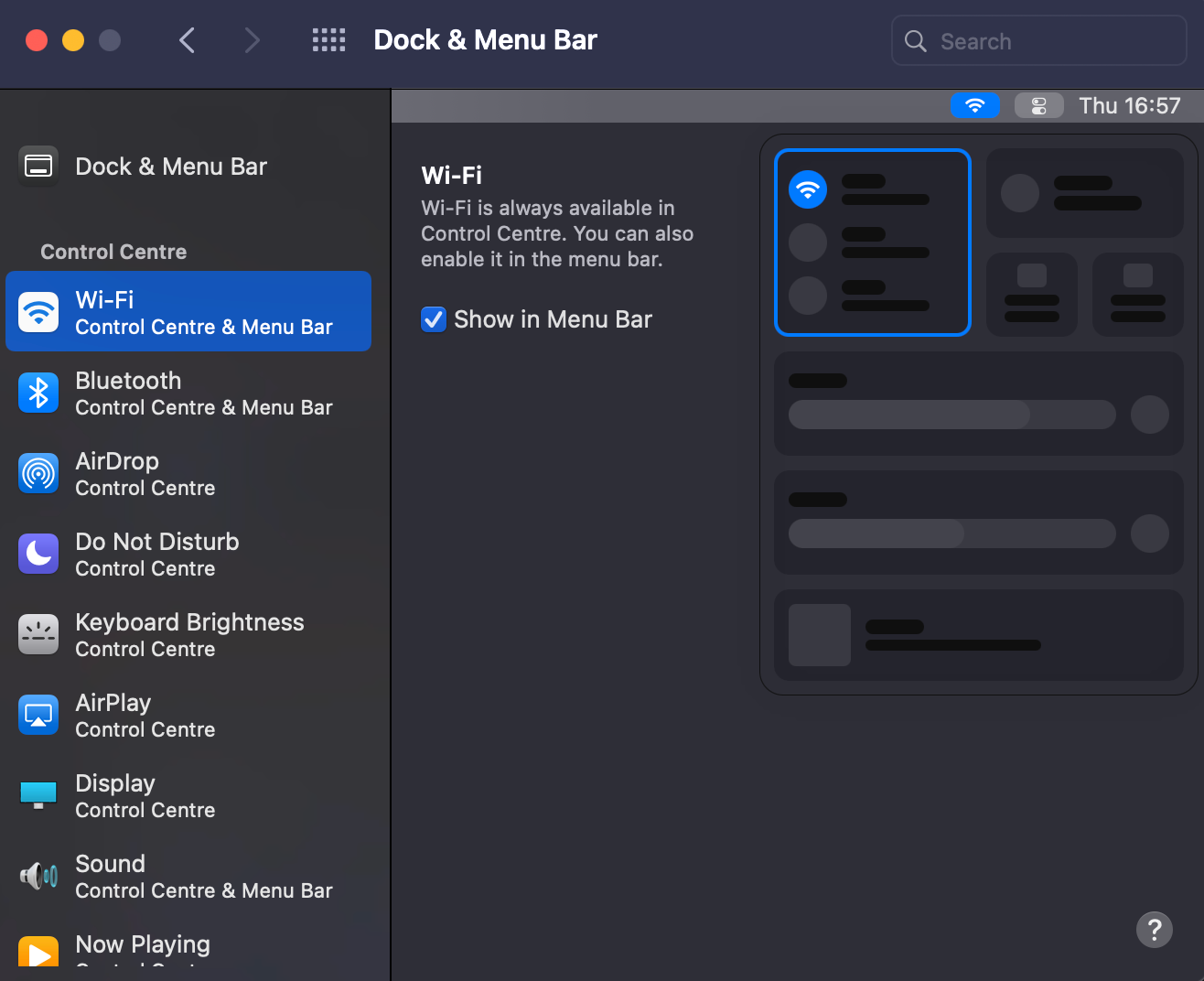 - Control center can be disabled/removed from menubar