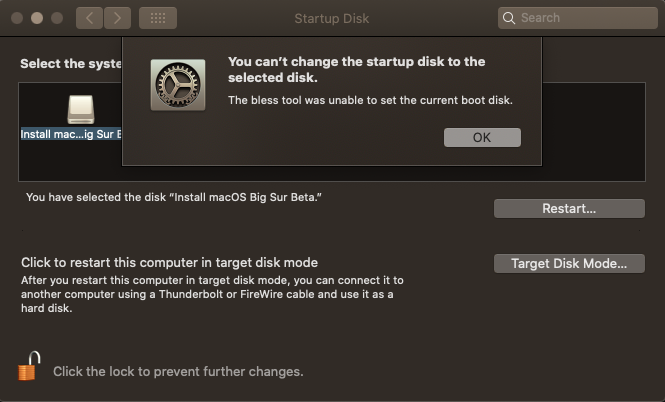 3. I went into Settings > Startup Disk > and selected Install macOS Big Sur Beta to restart (because it is not showing when restarting and holding the Option key to choose where to boot from.