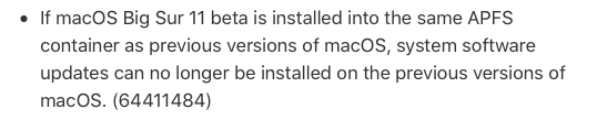 Yes, that could be the reason. Installing Big Sur in the same container as earlier releases is known to cause problems. It's in Apple's release notes for developers (but there are other problems beyond "updates can no longer be installed on the previous versions of macOS"):Doesn’t work for me, user is Administrator in system preferences, OS installed on separate Volume, but in the same APFS container. Could that be a reason?