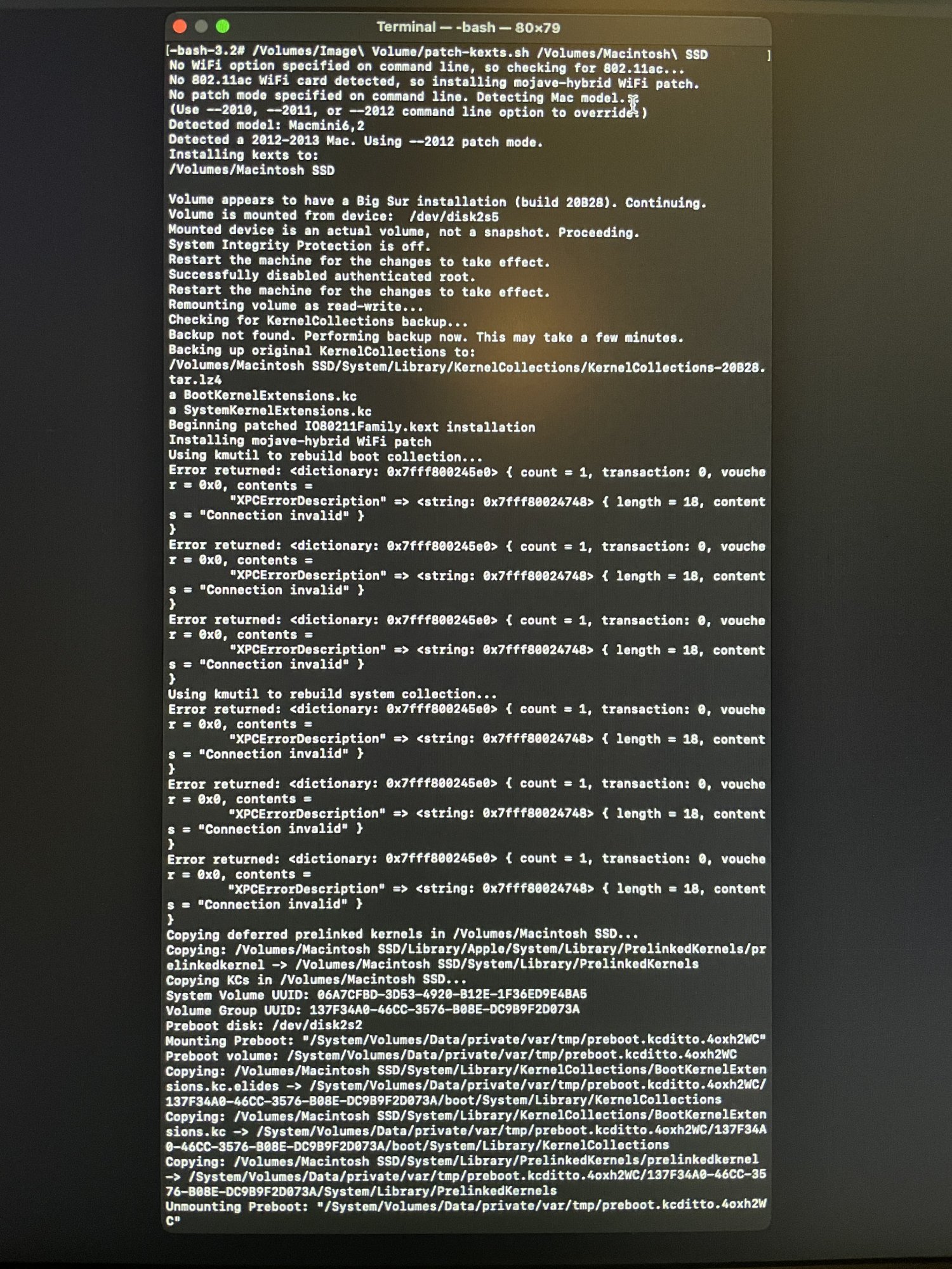 21c. Input "/Volume/Image\ Volumes/patch-kexts.sh" and hit enter, when finished enter "reboot", both without the quotes.
