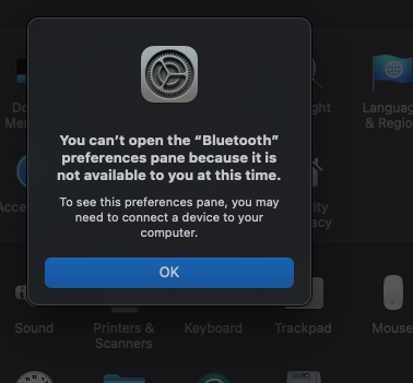 While login into Bigsur my blutooth has gone missing and I cant use keyboard or mouse except for wired. When I try to slide the bluetooth toggle on it shows my devices but bluetooth keeps going off. When I click on preference i get following error