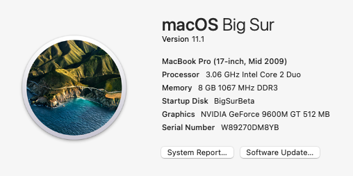 Reporting successful installation of Big Sur 11.1 (final release) on a 17” MacBook Pro 5,2 (Mid-2009) with C2D and Samsung SSD.