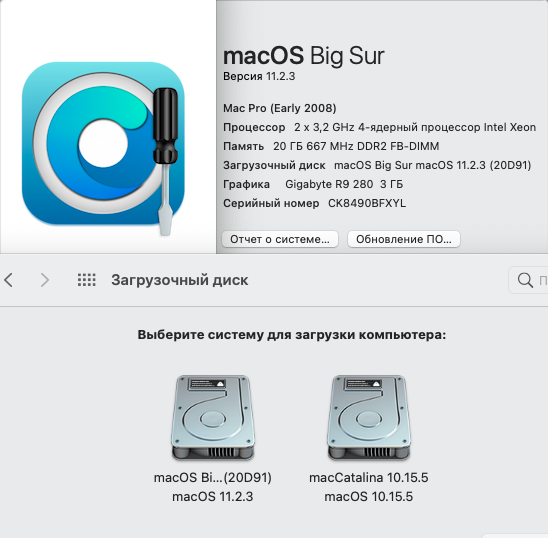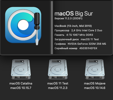 Samsung SSD EVO 860 1 TB — two partitions: 1st has Catalina and Mojave OSs installed, 2nd has Big Sur.