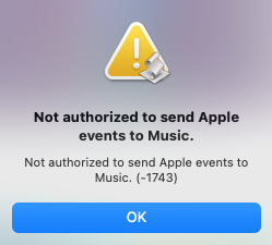 I keep getting this error message when trying to run third-party apps within Apple Native Apps like Photos, Contacts and Music. This error example is from Doug's Apple Scripts in Apple Music: