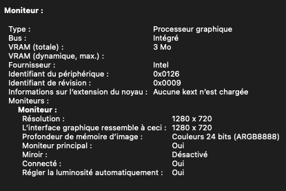Thanks. I see that your Mac Mini does in fact have Intel HD 3000 graphics (good) but that the kext isn't loading under Big Sur. Assuming you properly followed step 9 in the micropatcher README, I'm not sure what could be going wrong. (If you're not sure if you did step 9 properly, or if you didn't do it at all, then do it again. Just step 9, none of the other steps. Make sure not to forget the --2011 command line option -- if you forget that, WiFi might work but sound will not work. Or, if you've already installed jackluke's AirDrop fix, then use the --2011-no-wifi command line option to avoid overwriting that but still get working sound.)Here is on Catalina vidéo Card :