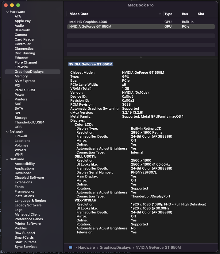 What monitors do you see if you run About This Mac > System Report > Graphics/Displays > NVIDIA GeForce GT 650M ?rehkram,