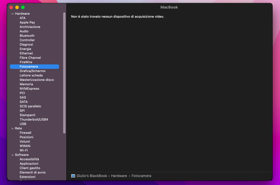 (I attached two screens, the first one is About This Mac, the second is the "Webcam" section. It says "No video capture device was found", in italian)