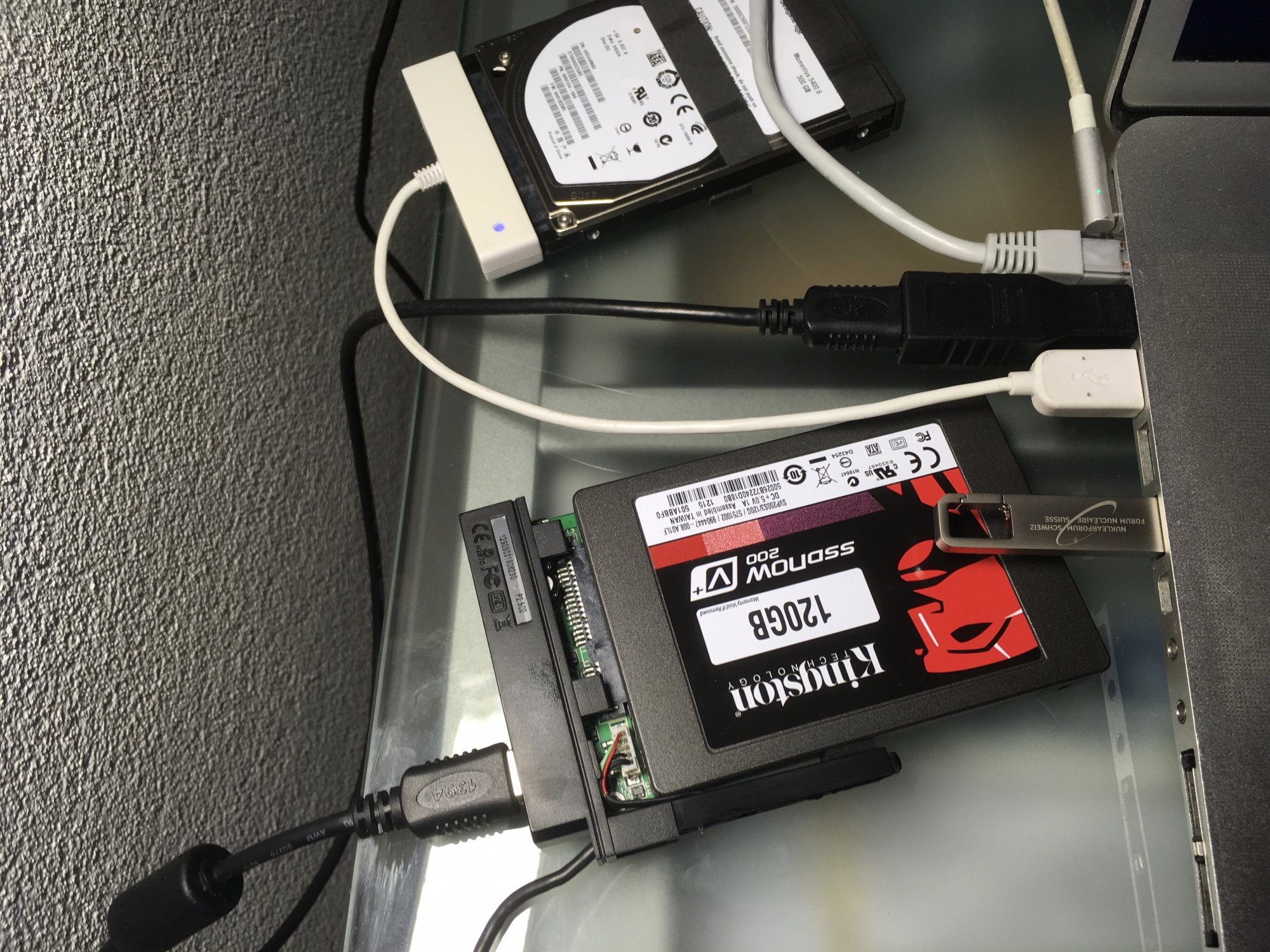 For a test I‘ve put the Kingston SSD which contains the installer, into the enclosure which has the FW port (plus unused USB). The target disk in on a USB2 adaptor.