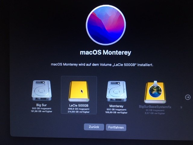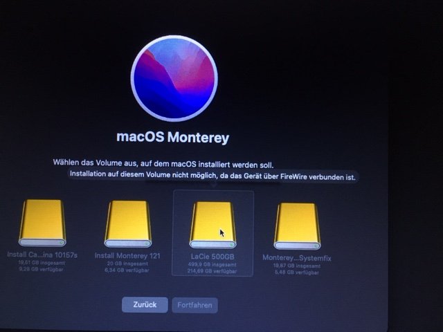 1) FW800->fail (Ø-Symbol) (Monterey Installer was selectable, then failed to load)
