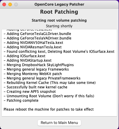 Ok - i wrote, that failed update with 0.4.1 (not beta) - other questions? And i know that 12.3 has a new kernel 21.4.0. My configuration without problem works with 12.2RC and 11.6.3RC. If penryn based Mini 3.1 works - on 4.2NB, maybe same gen CPU based CMP 3.1 should work to?OK. Here are three sources of problem possible: your configuration, imperfection of macOS beta and imperfection of OCLP. Why believe that OCLP nightly build (which is beta, too) will lead to problem's solution, not its multiplication?