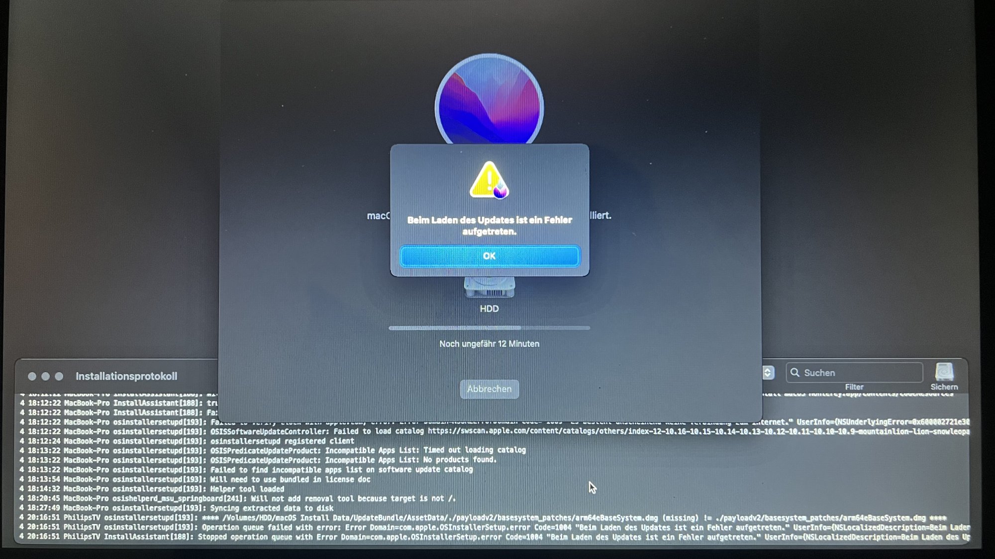 Now happened for the third time, that it failed with „12 minutes remaining“.Seems strange that is fails to find "ARM base system patches" - OCLP people should take a look at this, if it repeats to fail like this while installing onto a formatted disk.