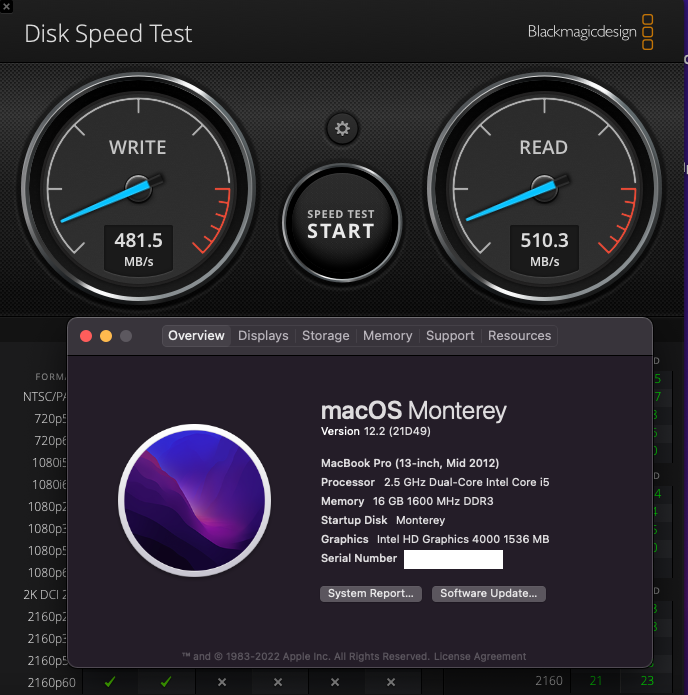 Honestly that seems kinda low, my 2TB in mine hits 450/500's. Mines running 11.6.3 perfectly.Out of curiosity, could someone post an SSD performance test (Aja or blackmagicspeedtest) of their mbr 13" mid 2012 system please. I wonder if an SSD upgrade could be worthwhile apart from gaining some more space.