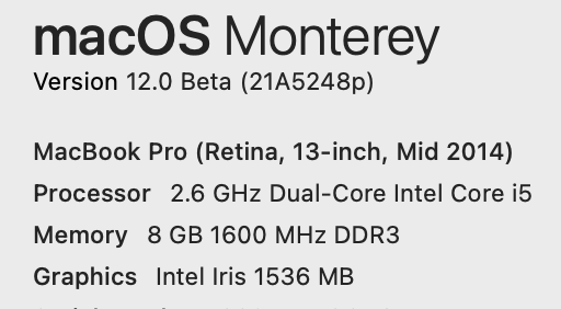 Hi everyone. Installed Monterey beta 1 on MacBookPro 10,1 (see signature) on a new partition, used OCLP 0.1.9. Wi-Fi and Bluetooth works properly. No UI graphic glitches seen yet. Lately, I use my MBP in clamshell mode mostly, installation of Monterey was made that way: it worked flawlessly but when I opened the lid, the display didn't wake up. Rebooting, the display turned on, but if I closed the lid, the backlight didn't turn off, as the integrated display was still on and working. Opened a couple of webpages on Safary, seemed pretty good and fast. So, except for Intel 4000 HD not showing under System Information (and guess not working too), that issue about opening and closing the lid, and fans spinning fast (likely because of the initial optimization/indexing of Spotlight), everything else seemed ok but I didn't have the time yet to test it thoroughly.