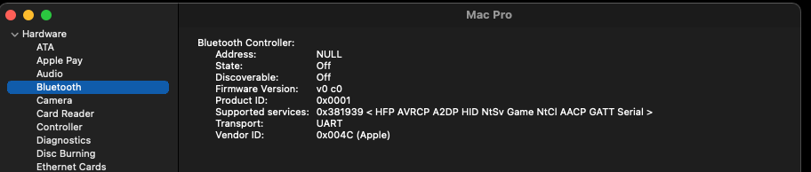 Bluetooth is pooched as well. This cMP has the updated BT4LE and Wifi card from a later iMac that was working fine in 11.5 beta 3 and 12.0 beta 1 but is now MIA.
