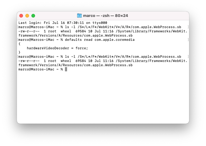Code:defaults read com.apple.coremedia ls -l /S*/L*/F*/WebKit*/V*/A/R*/com.apple.WebProcess.sb