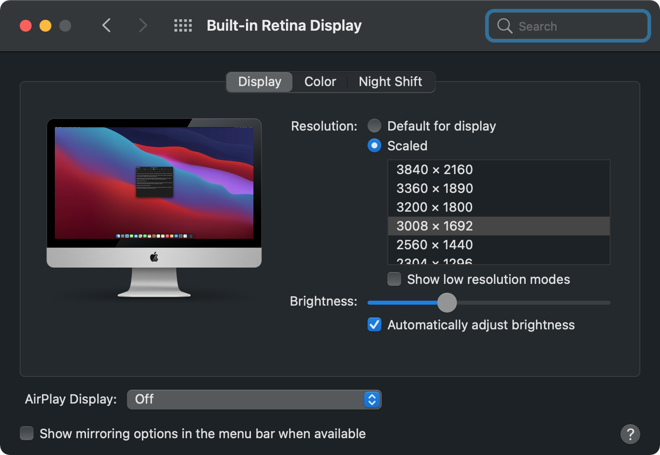 Tried to install using a test partition on my late 2014 5K iMac and got an error during the update that the startup disk could not be verified. The update didn’t succeed; I’m back on my regular Big Sur installation. Now the EFI seems to be somewhat goofed — my screen resolution options appear to correspond to those of a 4K iMac instead of 5K: