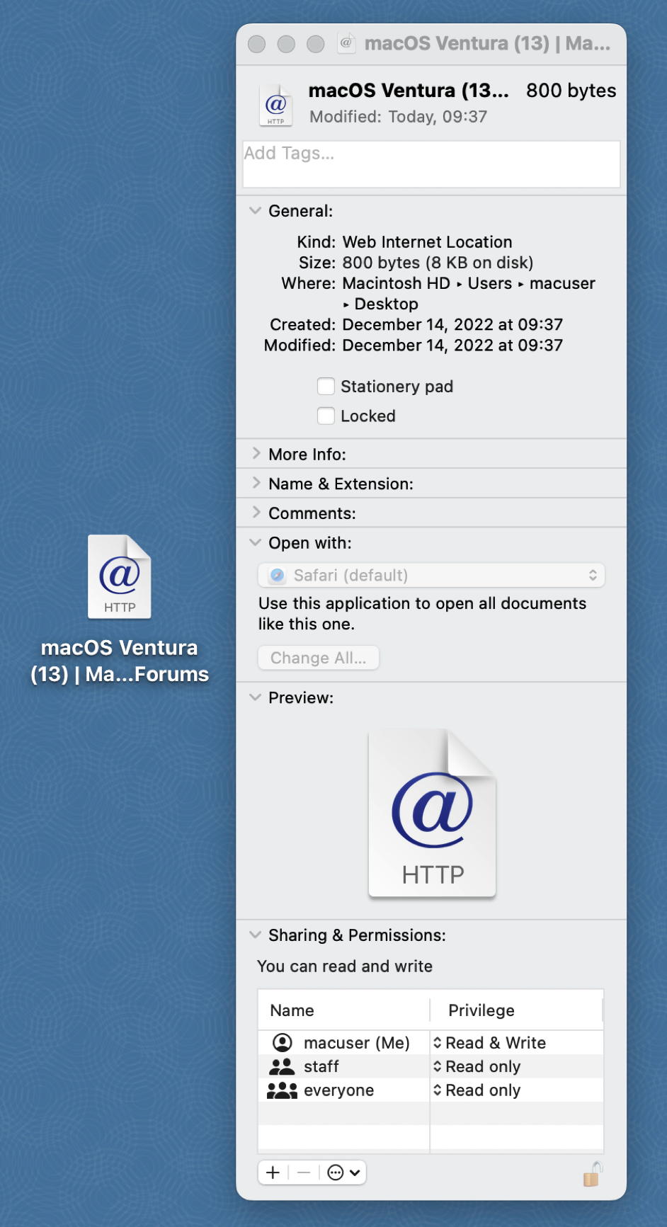 Since updating to macOS 13.1 link files, that I have dragged i.e. from Firefox onto the Desktop, open when double-clicked with Safari only. It is not possible anymore to change the default application for such files to Firefox.