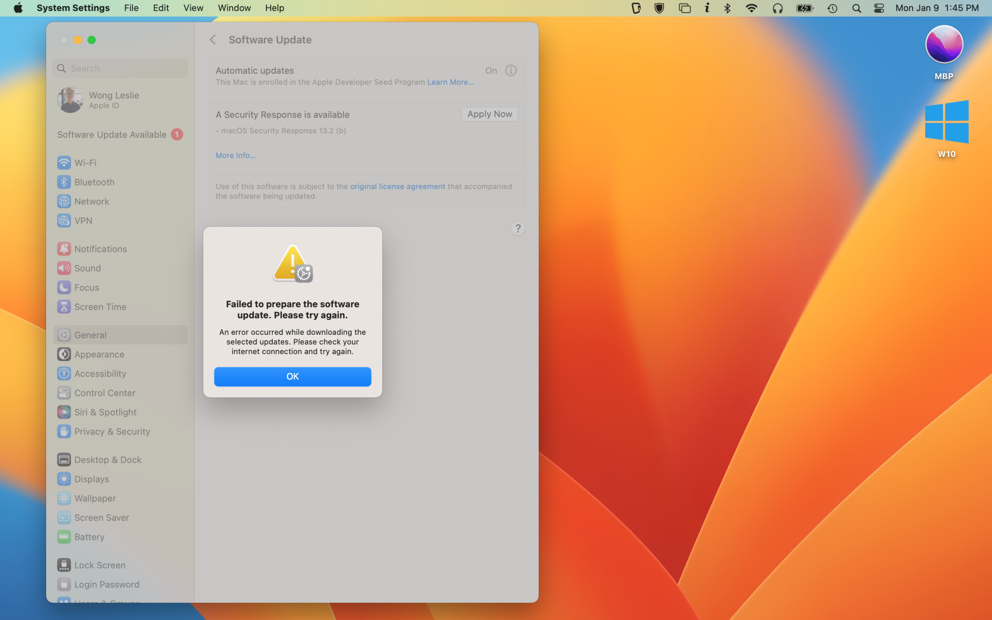 The update begins downloading then I get a dialogue box "Failed to prepare the software update. Please try again."