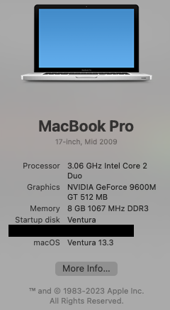 Installed 13.2 and subsequently 13.3 beta1 on a Mid 2009 MacBook Pro 5,2 (17” C2D at 3.06 GHz, with 8 GB of RAM, NVIDIA GeForce 9600M GT 512 MB GPU, and Evo SSD).