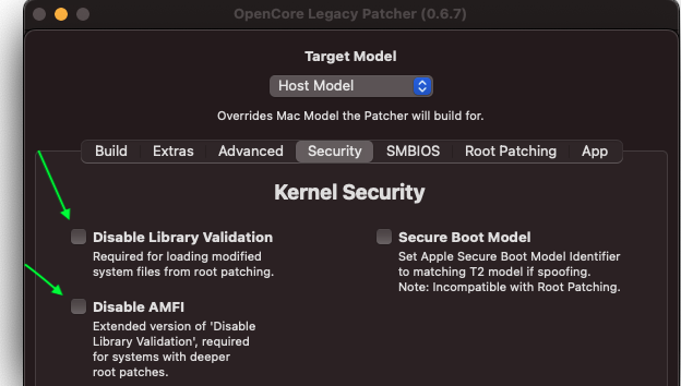 Yes, because you are now building an EFI for another machine, not the host. AMFI cannot be enabled for that target model (if there are root patches required) for backwards compatibility issues: the patcher doesn't know if your other machine has old root patches. Enabling AMFI with old root patches will break boot.Strange. I, too, have a hack. When I select my SMBIOS model on the Settings screen (don't leave as "Host Model")