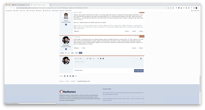 Well, that was my main complaint with Ventura, and also, icons in the Dock say for downloaded files would show as a generic document icon. Both I'm happy to say are working correctly now. So once Monterey is out of support, I'll upgrade the main system. Right now I run Ventura from a 7200 rpm 1 TB WD blue drive over usb 3. It's extremely smooth and responsive, especially for a mechanical drive install.Chrome and other chromium browsers slow loading has been fixed for a while in OCLP 0.6.8