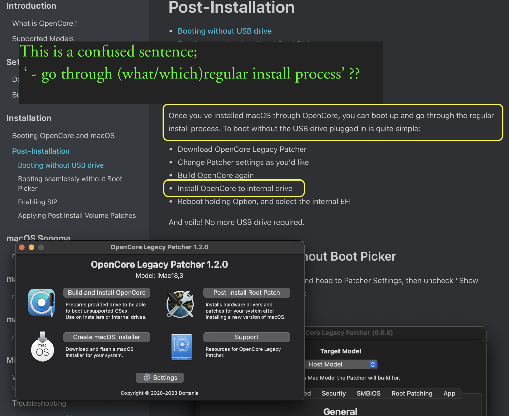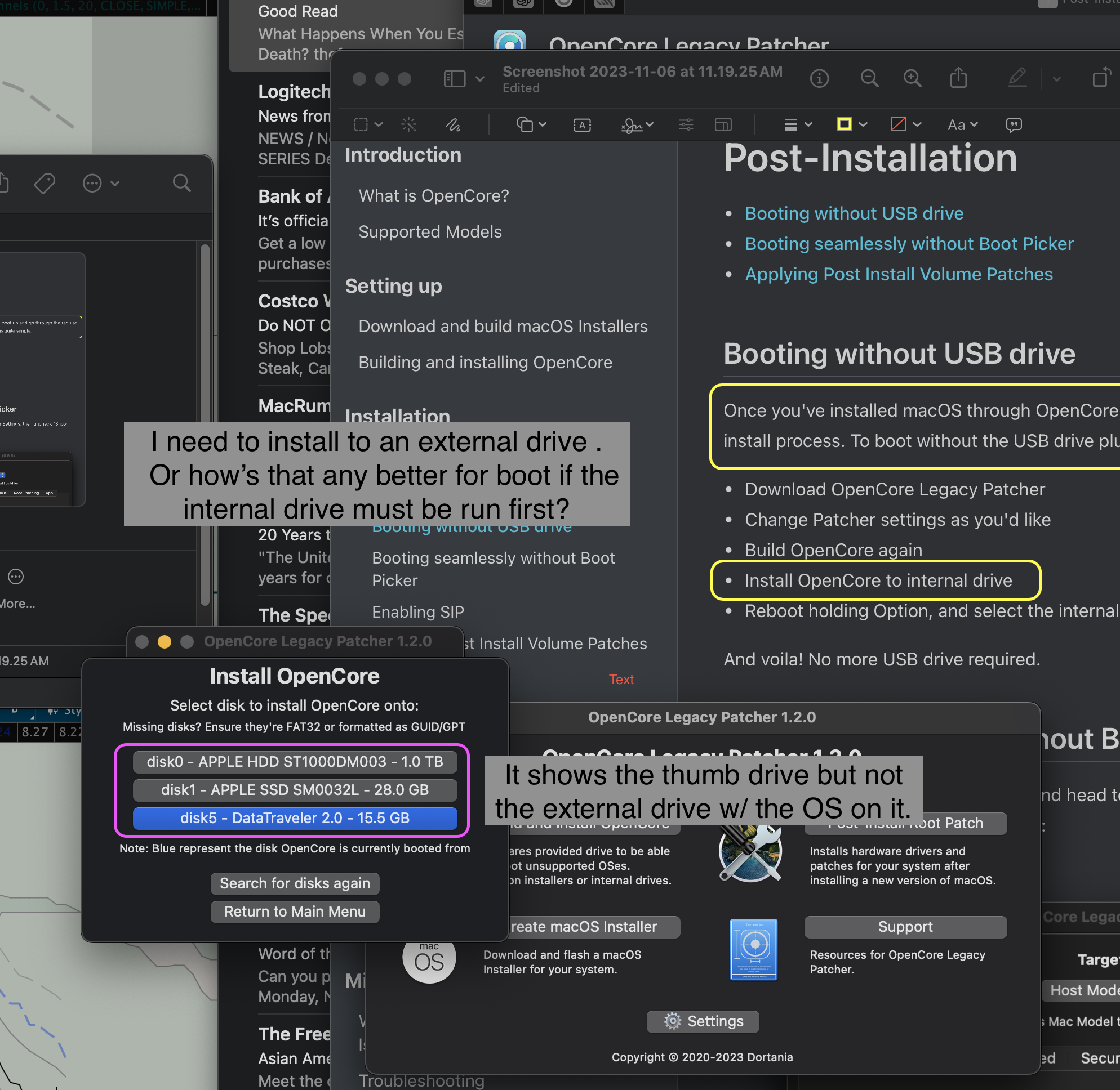 As I understand it you have received a menu for installing Sonoma to your external disk from DeeVeeDee. You should use an USB made by OCLP. This should include both the installer for Sonoma and the OCLP. You then boot using the USB and install Sonoma to your external disk. Use the alt key when booting and choose the right disk when installing.Oh, I forgot to mention - the machine I ordered is not yet shipped so if I can figure a way to use the core patch I'll cancel the order and make a donation to the developers