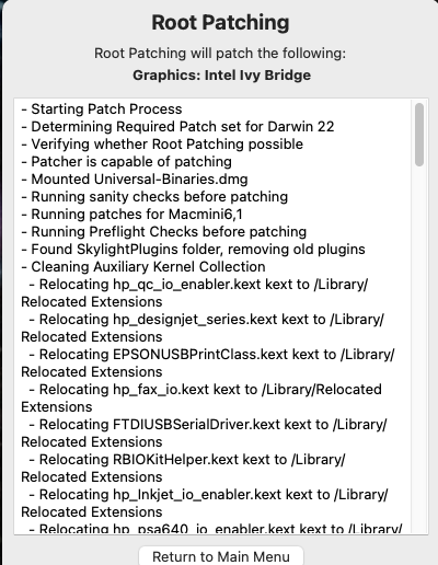 Ventura continued to load on to the mini. OCLP popped up and said I needed root patching which I started to do but then said it could not do it.