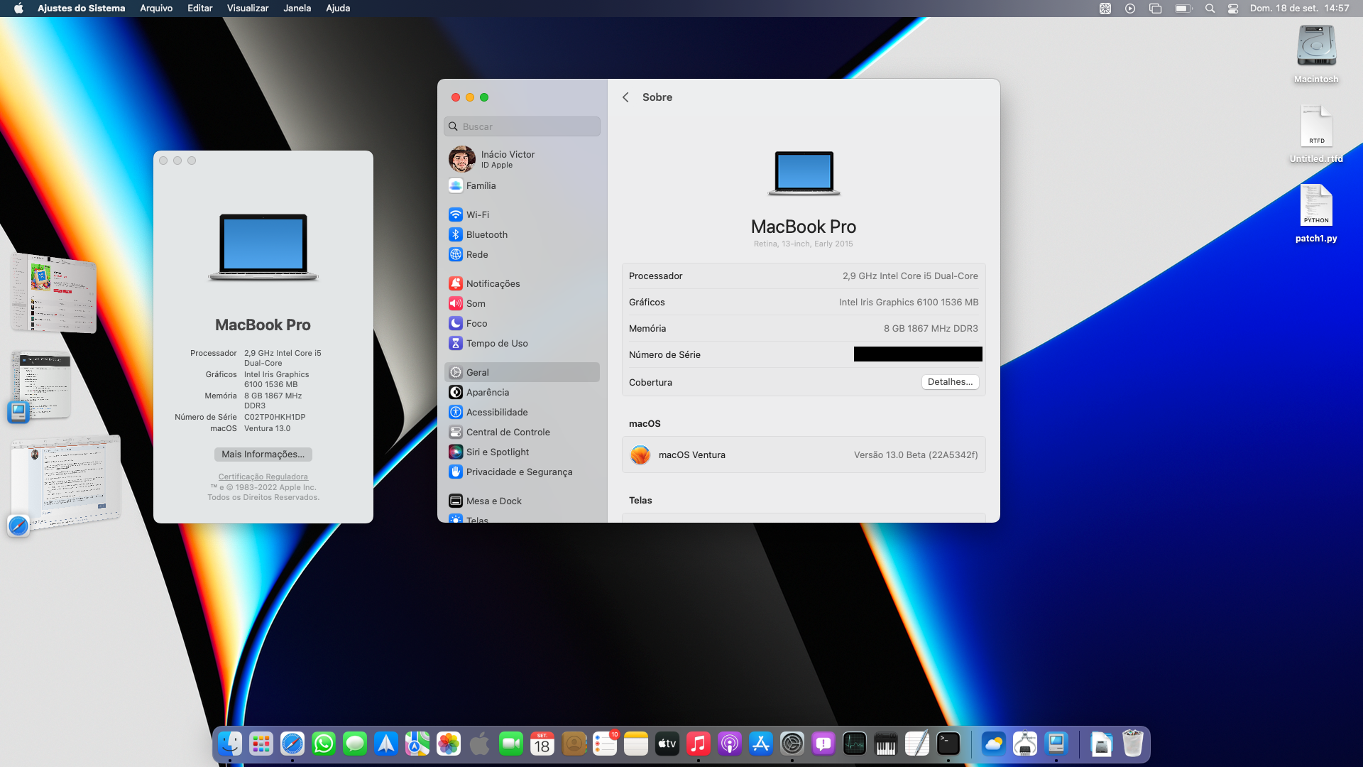 ^^^ No, no problems with the menu bar, here. (As for Acronis, as it worked normally in Big Sur and also works in Monterey on a non-root patched MBP11,1, I wondered if the window glitches in Monterey and Ventura on the MBP11,3 had something to do with the root patching or the partly broken OpenCL; of course, I cannot really expect to get support from the vendor, on an unsupported configuration. Well, I’ll just have to wait and see what happens: anyway, it’s not an essential program (got it once “discount-bundled“ with Parallels)…)