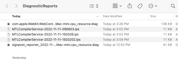 This is what I am suggesting. I'm far from the best person to read those diagnostic reports, but see if you can figure out what they're pointing to.I don't seem to have anything like that. It froze again today and there are only five log files in diagnostic reports for today.