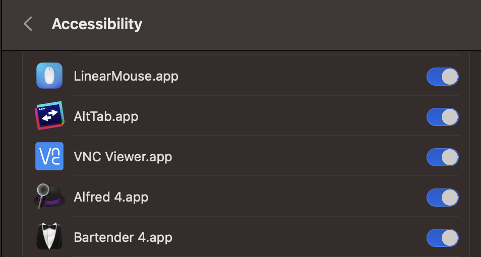 tccutil reset AccessibilityWhat's wrong with your Bartender? There was an update, mine's working great!Bartender partially not working, Remote Desktop not working, Little Snitch not working.