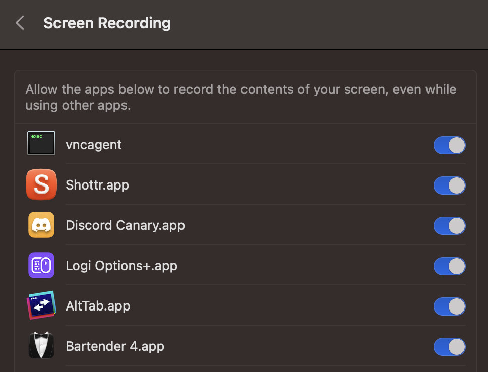 tccutil reset Accessibility in the terminal.tccutil reset ScreenCapture