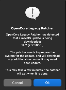 Saw that sort of notice when upgrading to the 14.1 final - just said ok and allowed it to install the necessary. Worked perfectly after a couple of switch offs and reboots.Upgrading Sonoma 14.1 (Release) to 14.2 Beta (patched with OCLP 1.2.0n built 11/5/2023 with Python3.11.5). This is the first time I'm seeing this: