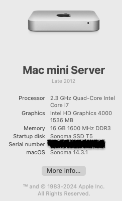 I posted about a week ago that I updated my 2012 Mac Mini to 14.3.1 and I used OCLP 1.3.0 with no issues:anyone running macOS 14.3 successfully with OCLP 1.3.0, specifically on a mini 6,2 perhaps?