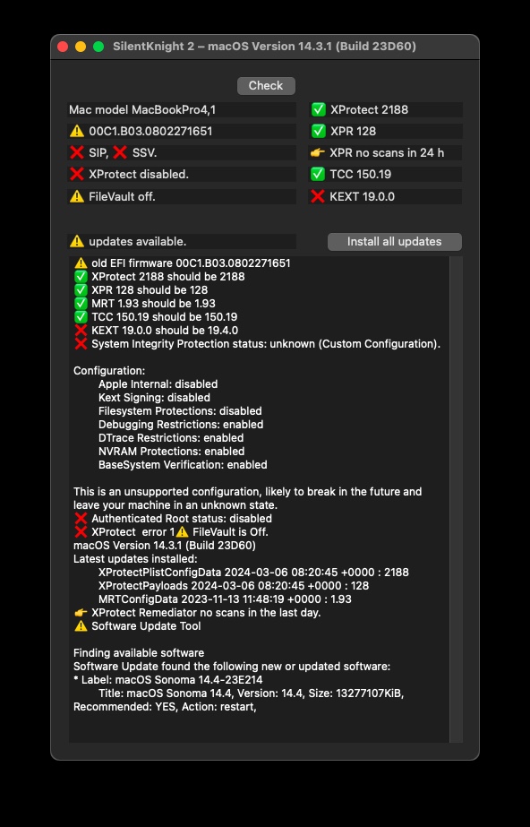 MacBookAir6,1 keyboard & mouse fixed with OCLP 1.4.1 and KDK_14.4_23E214.pkg also available - nice! (https://github.com/dortania/KdkSupportPkg/releases/tag/23E214)macOS 14.4 (23E214) with KDK_14.4_23E5211a.pkg OTA update works like a charm with OCLP 1.4.0 release on MP5,1 | RX580 | 990 Pro NVMe 😍 (and MacMini's, iMacs and MBP's 11,X 12,X also OTA from 14.3.1 to 14.4 all without problems, except MacBookAir6,1 no internal keyboard and mouse after login! Works with externel keyboard and mouse just fyi)