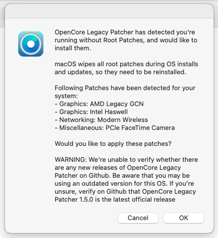 - com.dortania.opencore-legacy-patcher.auto-patch.plist checksums match, skipping
