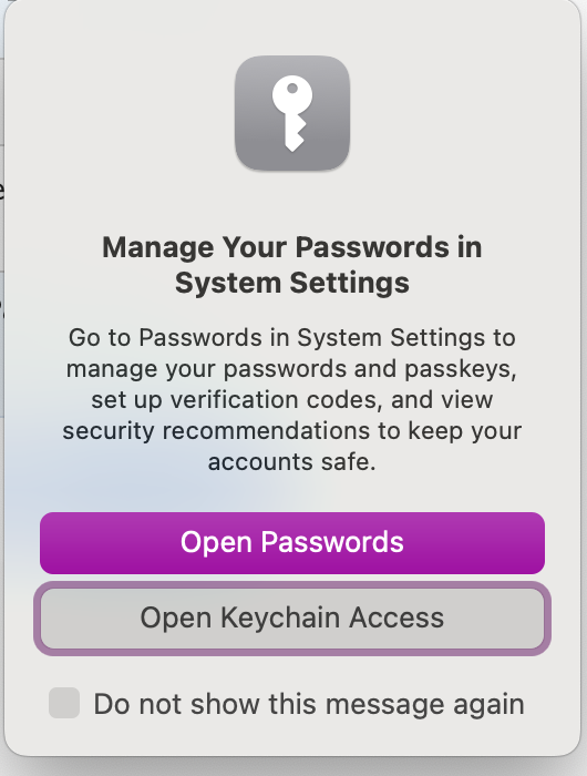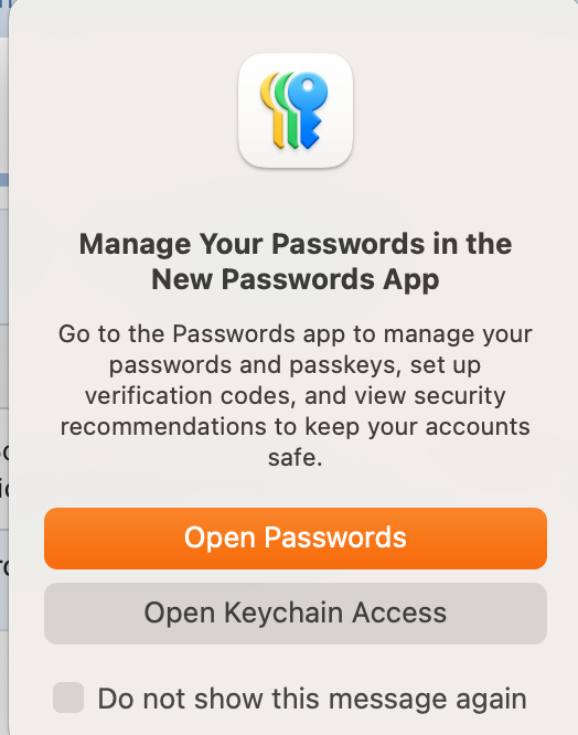 On Sonoma I already get that choice when opening KeyChain access, where it offers me to open up the Passwords in Settings, so that is not new.Actually, my bad. KA is still there, it's just hidden now in /System/Library/CoreServices/Applications. When opening the application, it gives you a choice between opening legacy KA or the new Passwords application.