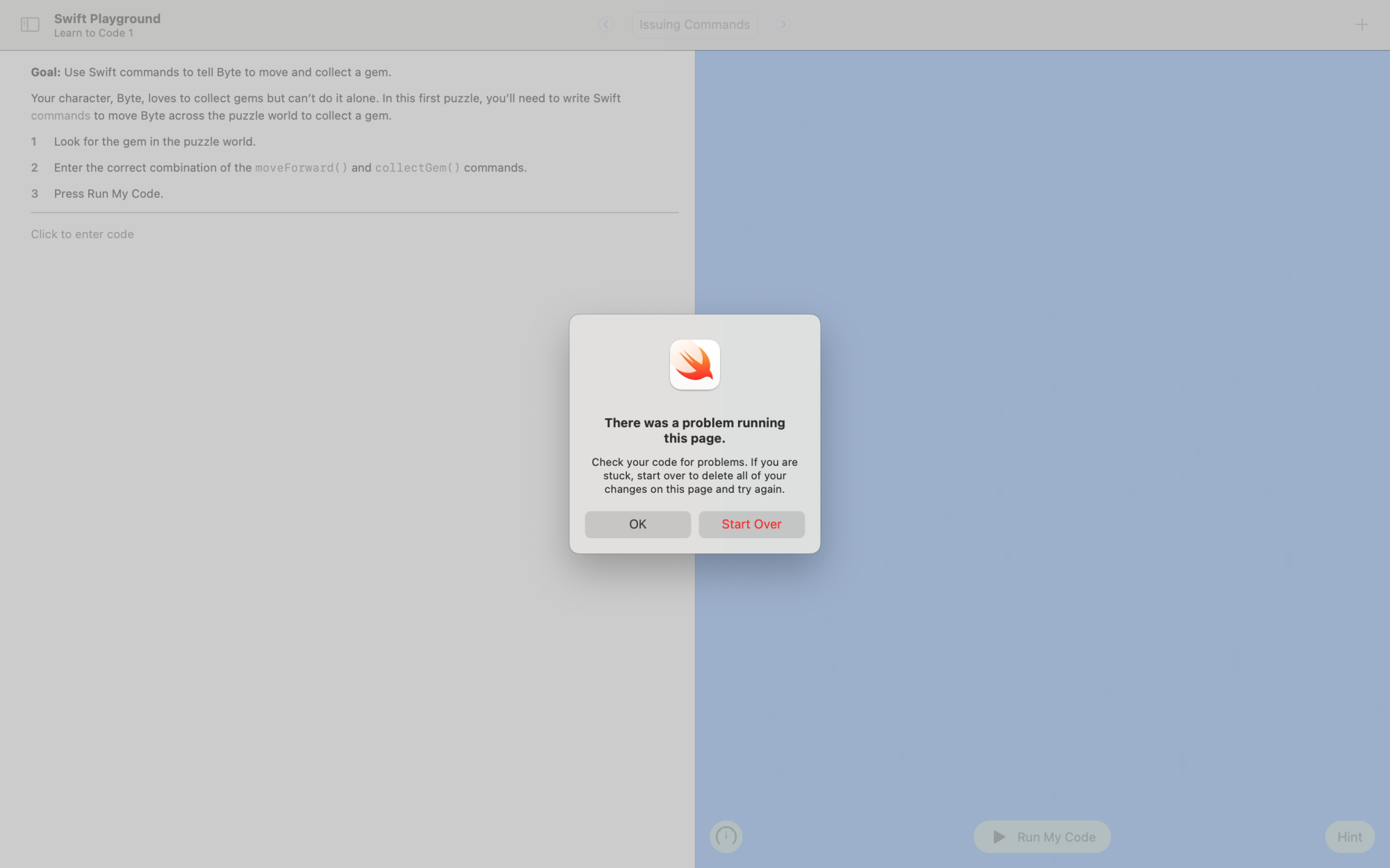 I download a playground like "Learn to Code" from Apple and the first couple pages load ok, but when the first exercise page opens, it displays an error saying "There was a problem running this page. Check your code for problems. If you are stuck, start over to delete all of your changes on this page and try again." - even when you haven't input any code yet and the animation pane on the right stays empty.What are your issues with Swift Playgrounds? I've tried it before on Sequoia, on this iMac 17,1, and it runs and downloads content, but I've never actually tried to run anything.