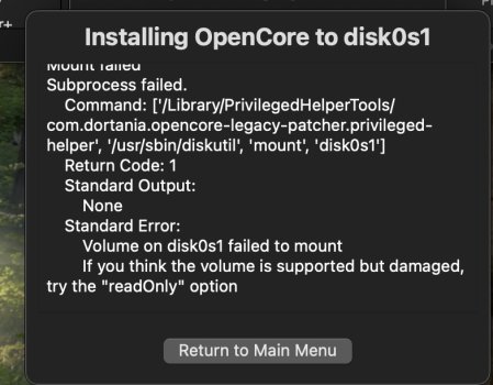 I'm on a MacBook Pro 13", 14.2 2017 and I first used to install Sequoia 15.0 OCLP 2.0.0. Installation went well and everything is working including Wifi after running the post-install. After upgrading to 2.0.2 I a getting a message saying that OCLP has detected that I am booting an outdated OpenCore build: Booted 2.0.0 Installed : 2.0.2 and asking me to update the OpenCore bootloader. But after accepting and doing it I get an error message: Mount failed.....Try the "readOnly" option. I can't see where I can find this option but what is strange is that all the apps and the MacBook is working including the wifi so I dont understand the error message !!!!!!! Big thanks to anybody able to explain me whats wrong and how I can correct the error message and also where I can find this "readOnly" option ??????