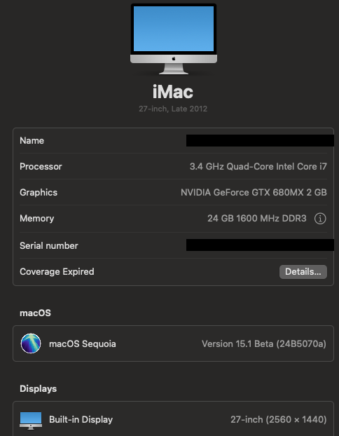 iMac 13,2 late 2012, 27” with original internal fusion 1T HDD and an external Evo SSD 1TB.