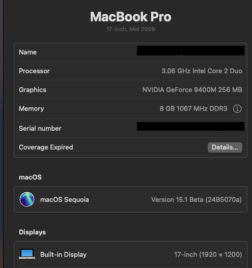 Again, changed the heading in the OCLP (via “settings” section) to MacBook Pro 5,2, since default heading was “Host Machine”. When changed to MacBook Pro 5,2 heading, choices available for modification were different than under Host Machine” heading. I further did select full feature-unlock option and Firewire booting. Installation proceeded as described above for iMac. Once the post-install patches were applied there was graphics acceleration. Hand-off, screen mirroring and iMessage were fully functional.