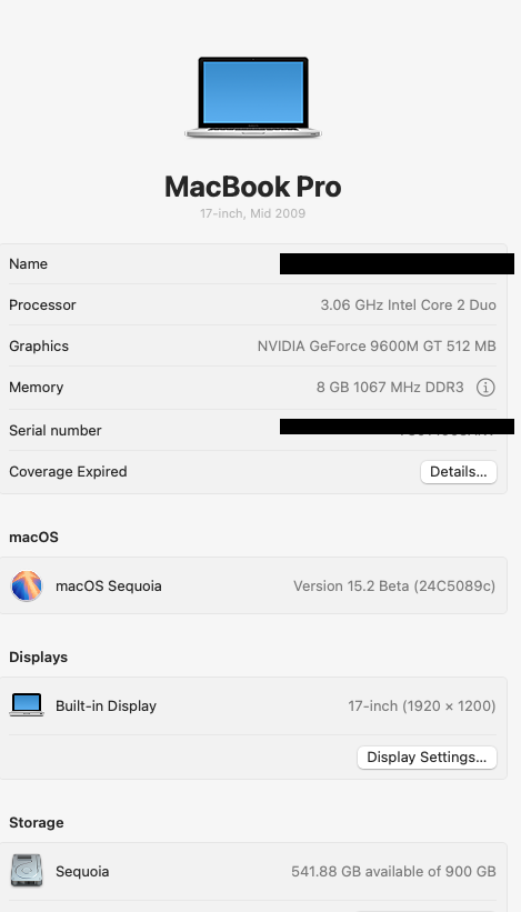 MacBook Pro 5,2 (not metal compatible), installed Sequoia 15.2 beta4 OTA with OCLP 2.2n over Sequoia 15.1.1 (the latter has same functionality as the new 15.2 beta4)