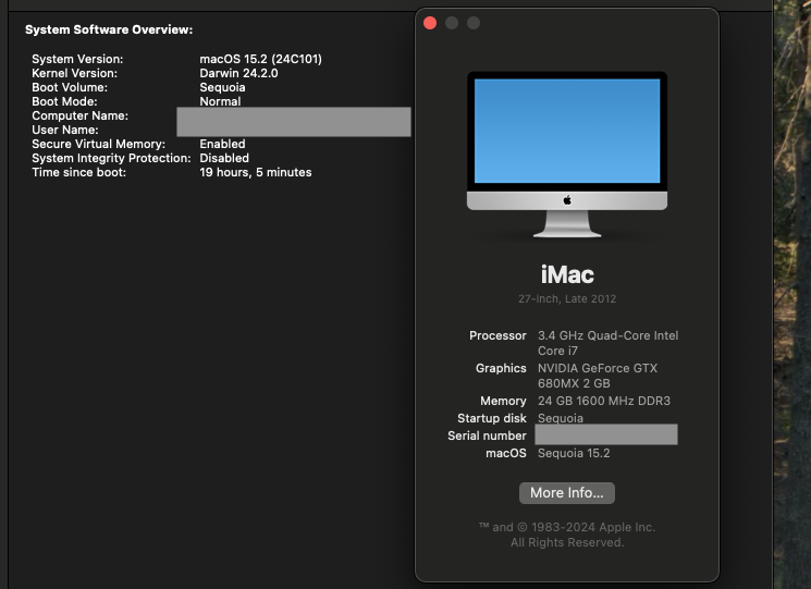 Installation proceeded without issues. Patching was also smooth; there was no request attempt by OCLP to download new Metalib package. However, I previously transplanted Metaliib folder, from an external drive running15.2RC to the iMac internal drive; the latter run Sequoia 15.2 - 24C100, so there was a Metalib resident when 15.2 - 24C101 was installed. See post #2072 or, for alternate method, Tom1211’s posts (above) regarding MetaLib package "fix".