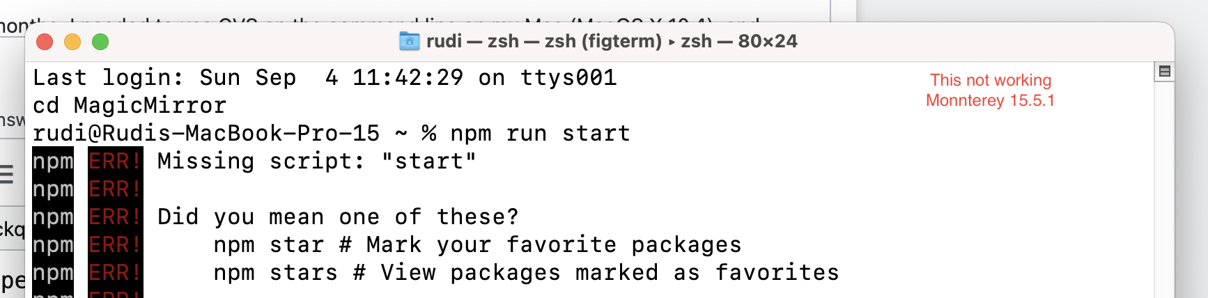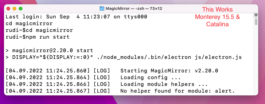This simple script suddenly stopped working on my MBP Monterey 15.5.1. However it still works in my mac mini Monterey 15.5 and my MBP Catalina. The script refuses to Change Directory (cd) no matter what I try. The result being the "npm run start" command is presented to the normal command line not the MagicMirror directory. Thanks for any help/advice.