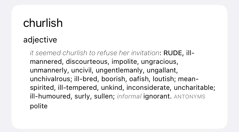 You accuse me of being entitled, but what it clearly shows; is I paid attention at school. Maybe your definition of churlish is limited to it being simply being rude, however, it has many other meanings, and I chose to use one of them in my response.