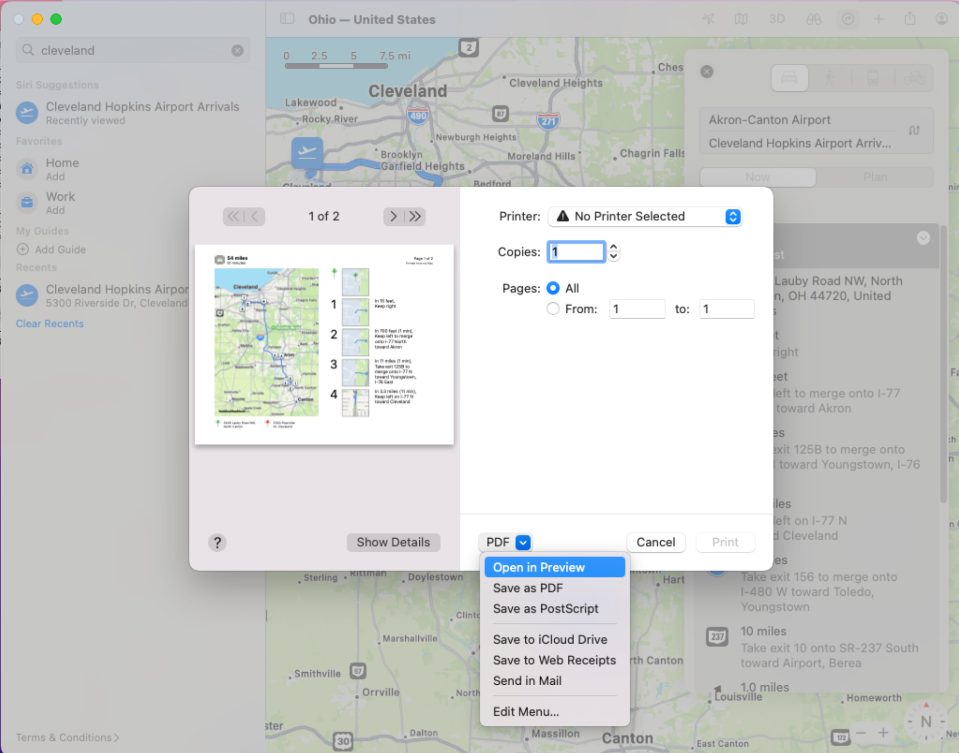 Maps offers a nice set of directions to get from where I am to where I want to go: turn here, turn there, etc. I'd like to make a text file that I can print to carry with me. But I can't select the text in the directions. There's a Share to Notes option under File, but that just copies the map, not the directions. Do I have to type out all the directions manually?