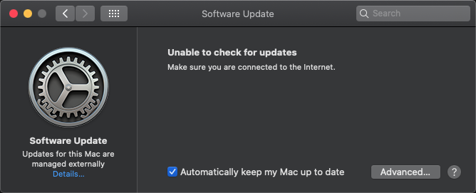 Try runningWell this is interesting. My software updates suddenly claims I have no internet and that my updates are managed externally.