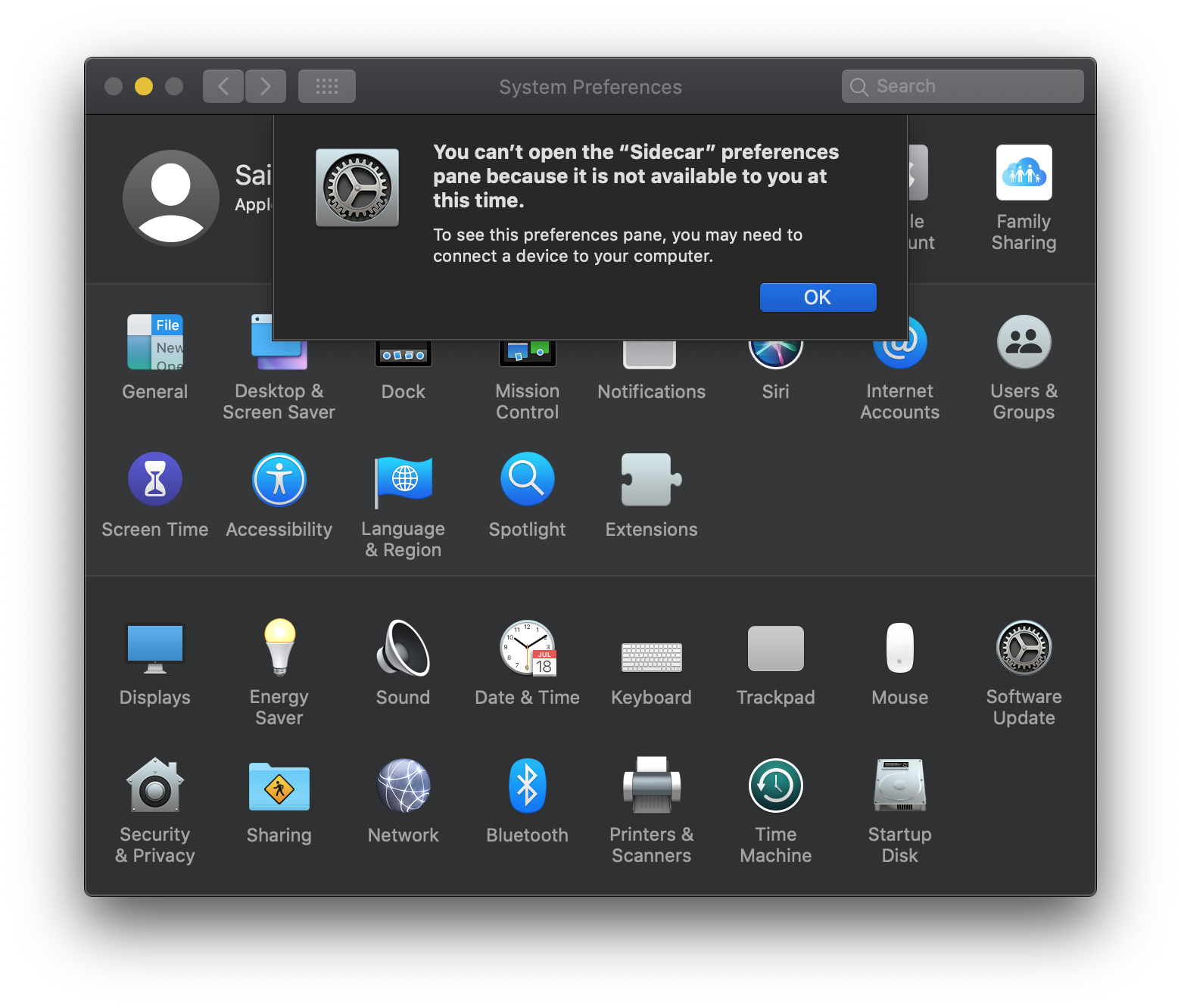 I have the exact same problem, launched through Spotlight. No Sidecar in System Preferences. 12.9" iPad Pro 2018, 15" MacBook Pro 2014.Not sure if this is a bug. But sidecar is not working on my 10.15 mbp and ipad pro 9.7. The error shown is: