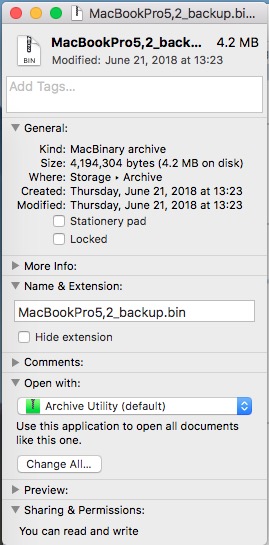 Hi sgtaylor5. Ive examined the MacbookPro5,2_backup.bin and it is only 4.2MB in size and wondering if it was created completely and correctly when I ran the APFS Rom installer. Is there a way of confirming if the backup file is complete before restoring it to my laptop. Just hesitating as I dont want to brick it again. What do you recommend?